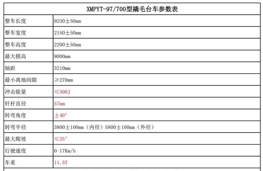 XMPYT系列撬毛臺車:是目前國內(nèi)非煤礦山廣泛應(yīng)用于井巷冒頂片幫隱患治理的專用設(shè)備,也叫巷道清理機、撬頂車。目前定型生產(chǎn)的XMPYT系列撬毛臺車,主要有:XMPYT-97-700A型、XMPYT-97-700B型和XMPYT-45-450型等3個通用型號的產(chǎn)品,其中,按適用細化設(shè)計分類,每個型號經(jīng)特殊設(shè)計配置,可分為通用型、高原氣候型、高溫環(huán)境型和遙控操作型等系列產(chǎn)品。